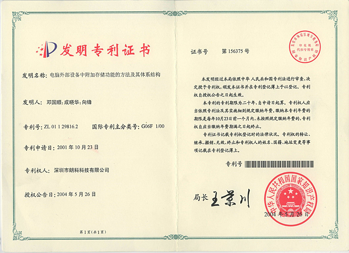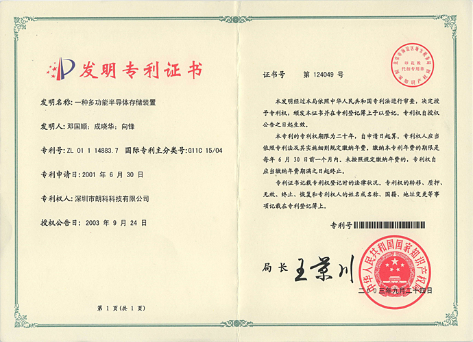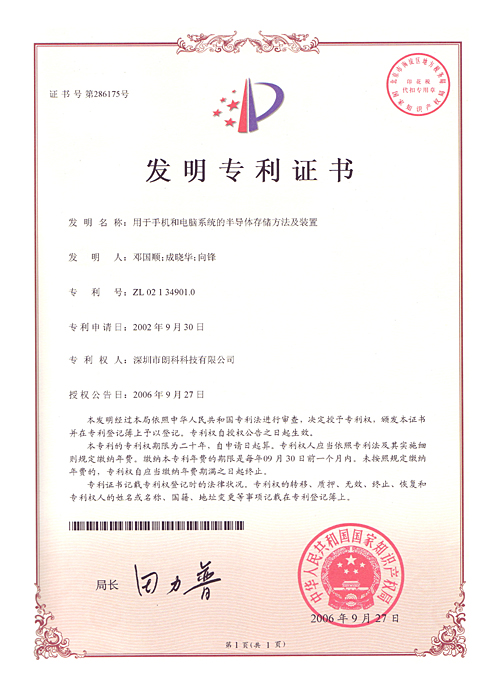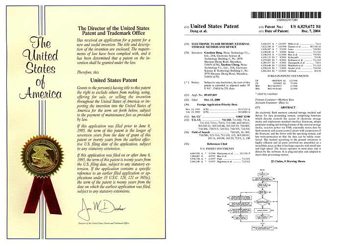 本公司作为国内外最早涉足闪存应用及移动存储领域的公司之一,通过持续技术创新,率先在业内推出了基于USB接口、采用闪存为存储介质的移动存储产品——闪存盘,并在国内申请了第ZL99117225.6号中国发明专利“用于数据处理系统的快闪电子式外存储方法及其装置”等一系列原创性基础发明专利及其他核心专利。该系列专利是中国在闪存应用及移动存储领域原创性基础发明专利及核心专利,填补了国内闪存应用及移动存储领域20年无核心专利的空白。公司还通过持续的技术创新,围绕闪存应用及移动存储领域研发了一系列其他核心技术及其专利,形成了完整的专利布局和“专利池”。